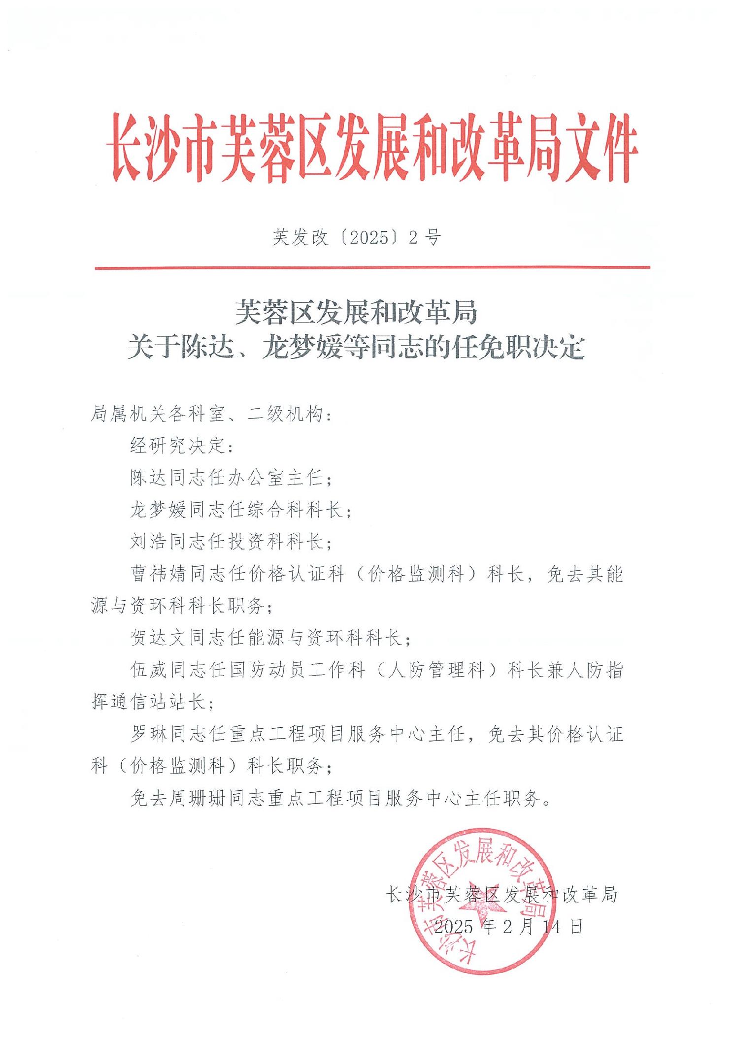 芙蓉区发展和改革局关于陈达、龙梦媛等同志的任免职决定