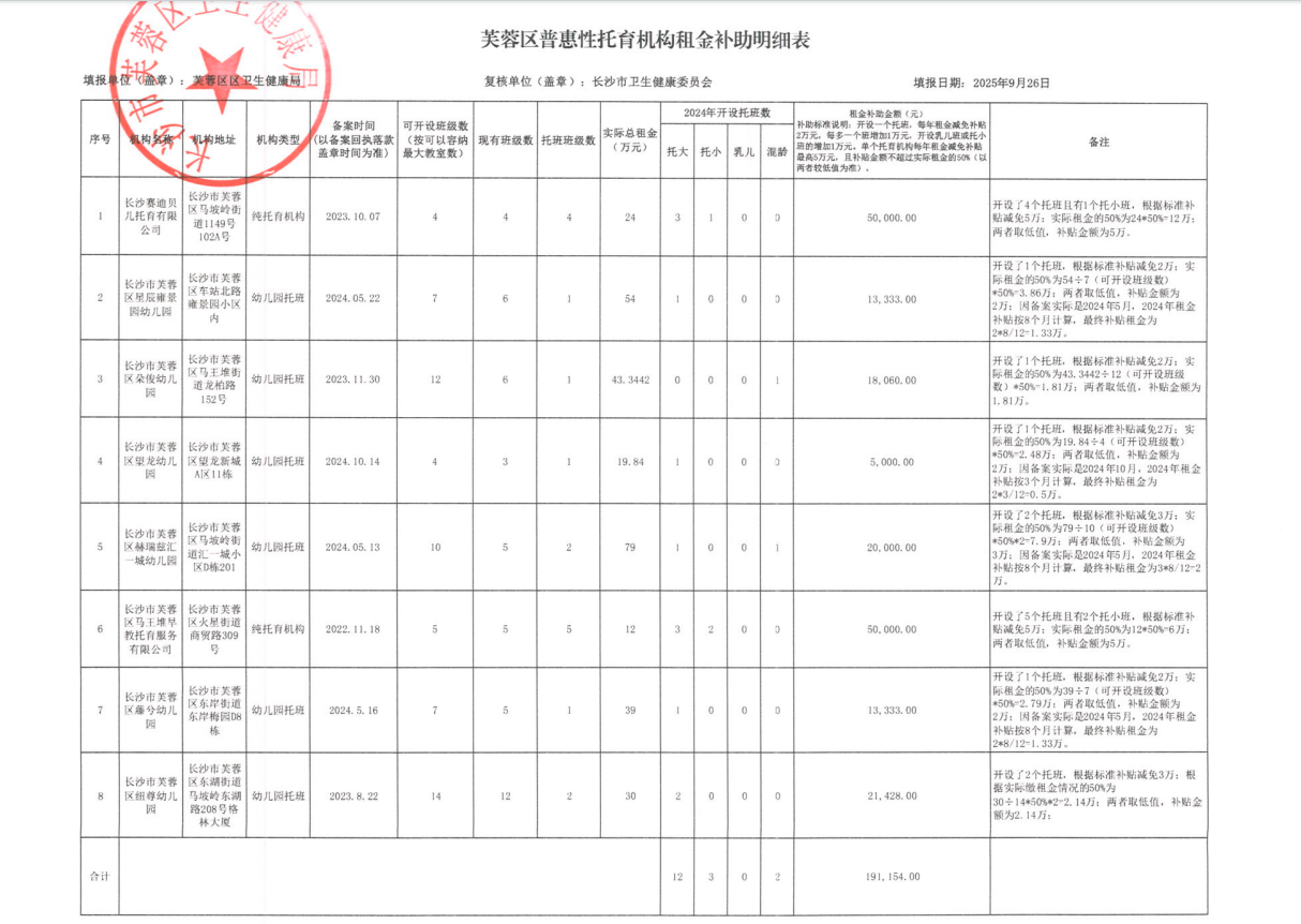 为推进托育民生工程顺利实施,根据长沙市卫生健康委 长沙市财政局《关于印发长沙市普惠托育服务发展示范项目资金管理细则的通知》文件要求,对2024年普惠性托育机构进行租金减免减负项目。对已备案的普惠托育机构,开设一个托班,每年租金减免补贴2万元,每多一个班增加1万元,开设乳儿班或托小班的增加1万元。单个托育机构每年租金减免补贴最高5万元,且补贴金额不超过实际租金的50%(以两者较低值为准)。现经普惠性托育机构自愿申报,区卫生健康局审核,市卫生健康委复核,2024年芙蓉区共有8家普惠性托育机构申报租金减免补贴(详见附件)。