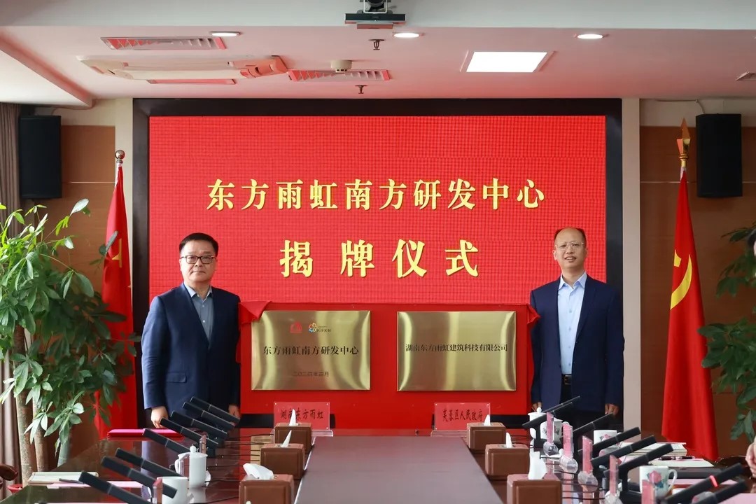 仪式现场,湖南东方雨虹建筑科技有限公司与芙蓉区凯发一触即发签署合作协议,何绍军、周春晖为“东方雨虹南方研发中心”揭牌。